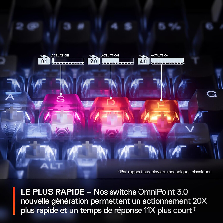 Le cœur de l’innovation de ce clavier réside dans ses switches magnétiques OmniPoint 3.0. Ces interrupteurs de type Hall Effect utilisent un capteur magnétique pour détecter la position de la touche, au lieu d’un contact mécanique traditionnel. Cela apporte deux avantages majeurs : une vitesse d’activation fulgurante et une course d’actuation ajustable. Concrètement, il est possible de régler le point d’activation de chaque touche entre 0,1 mm et 4,0 mm via le logiciel SteelSeries GG. On dispose de 40 paliers au total, offrant une personnalisation sans précédent de la réactivité clavier. Vous pouvez ainsi choisir une frappe ultra-sensible à 0,1 mm (une légère caresse suffit alors à déclencher la touche), ou au contraire une frappe plus profonde et intentionnelle à 3–4 mm pour éviter les fautes de frappe. SteelSeries annonce que ces nouveaux commutateurs OmniPoint 3.0 sont jusqu’à 20 fois plus rapides que des switches mécaniques classiques, avec une latence réduite de 11 fois. En chiffre, la marque évoque un temps de réponse plancher d’environ 0,7 ms seulement, ce qui est extrêmement bas (bien en deçà d’une milliseconde).