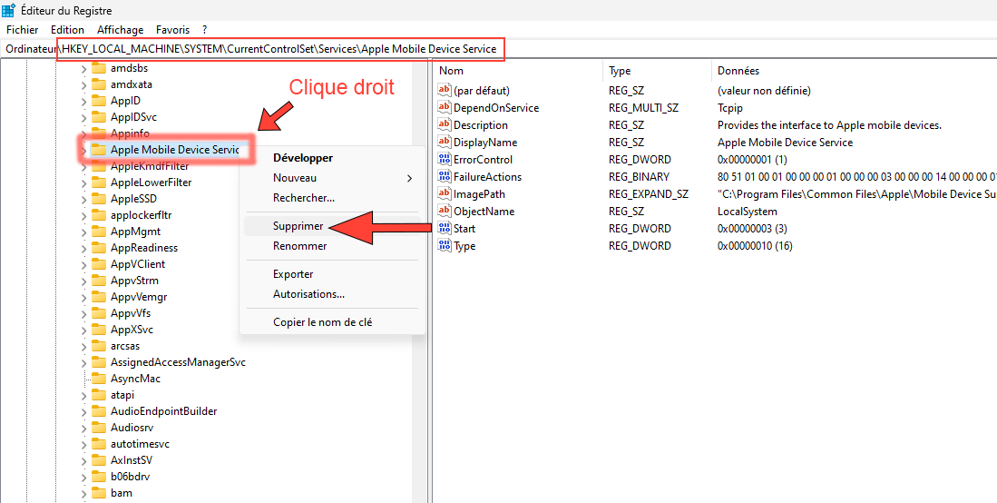 Le service choisi porte le nom de Apple Mobile Device Service, notez le quelques part et passons à la suite pour le supprimer !