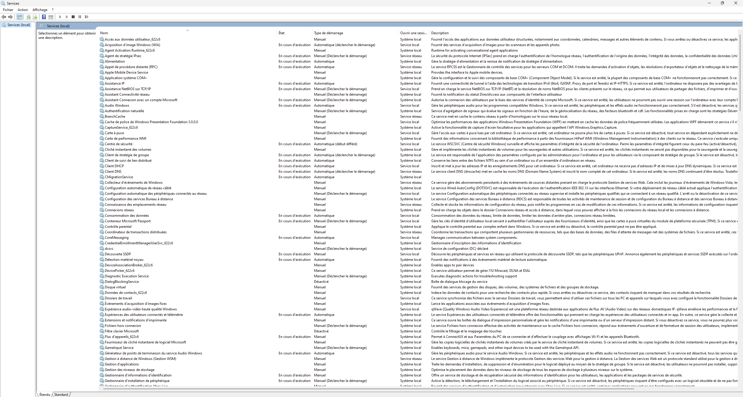 Appuyer sur les touches Windows + R en même temps et taper services.msc, une liste des services Windows va s’afficher, comme ceci :