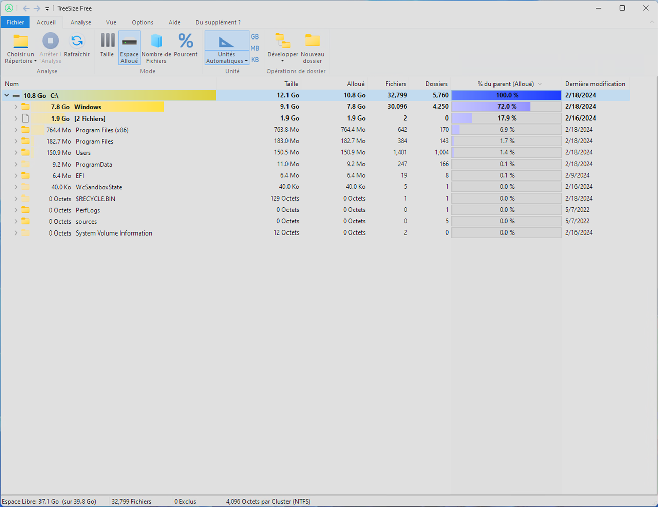 TreeSize Free, un outil gratuit, vous offre une visualisation rapide de l’utilisation de l’espace disque sur votre ordinateur. Son interface conviviale vous permet de repérer facilement les dossiers et fichiers les plus volumineux, vous aidant ainsi à identifier les principaux responsables de l’encombrement de votre disque et à effectuer le nettoyage nécessaire 😉.